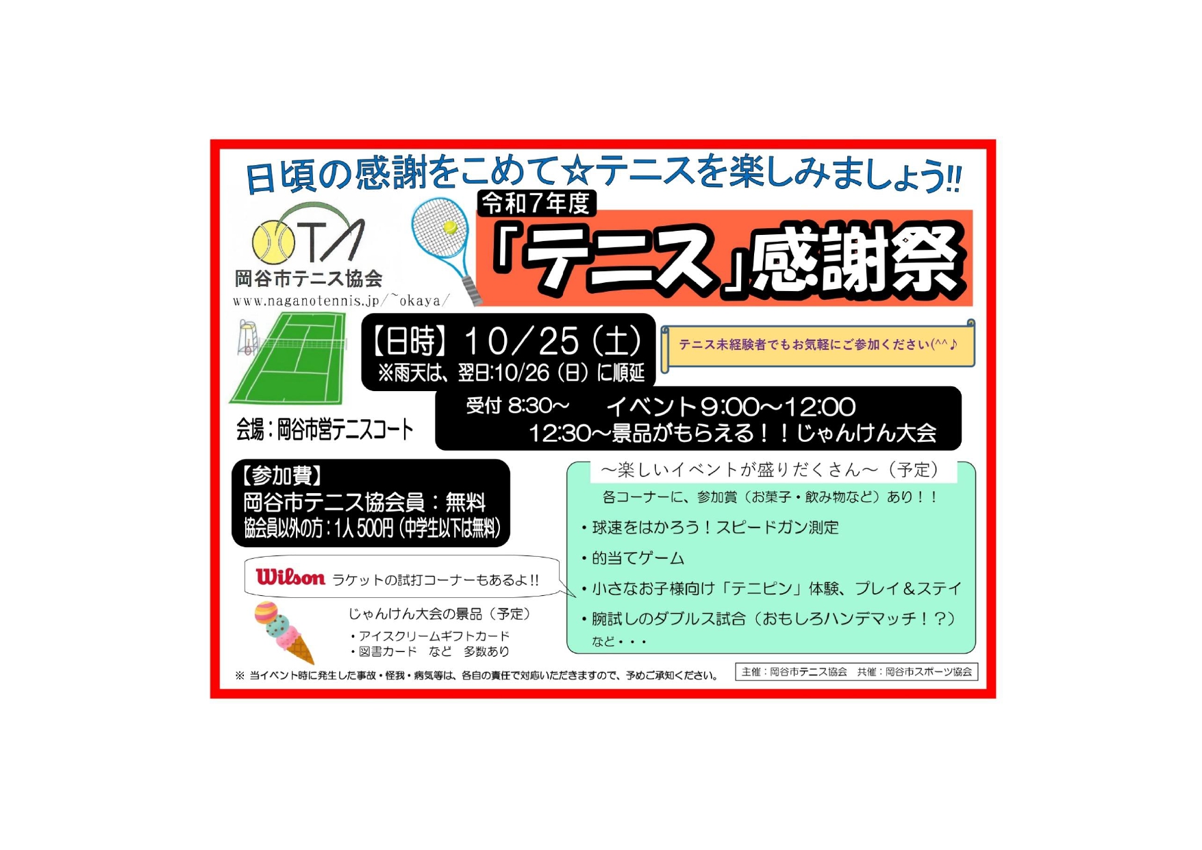岡谷市テニス協会はネットワーク、フットワーク、チームワークをモットーに、子供から大人まで全ての年代が参加できる感謝祭、団体戦などで楽しみながら活動しています。