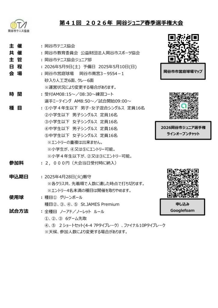 <ジュニア部>第41回 2026年 岡谷ジュニア春季選手権大会 2026 4/09 2026-04-09 申し込み Googlefoam ラインオープンチャット 当日の天候などの情報を共有します。大会終了後は削除します。 ジュニアのページ 新着情報 <ジュニア部>2026年3月29日 諏訪市交流戦
