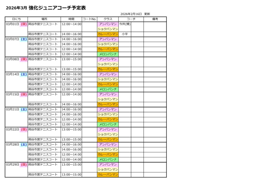 <ジュニア部>ジュニア強化練習 コーチ予定表 & 欠席連絡
