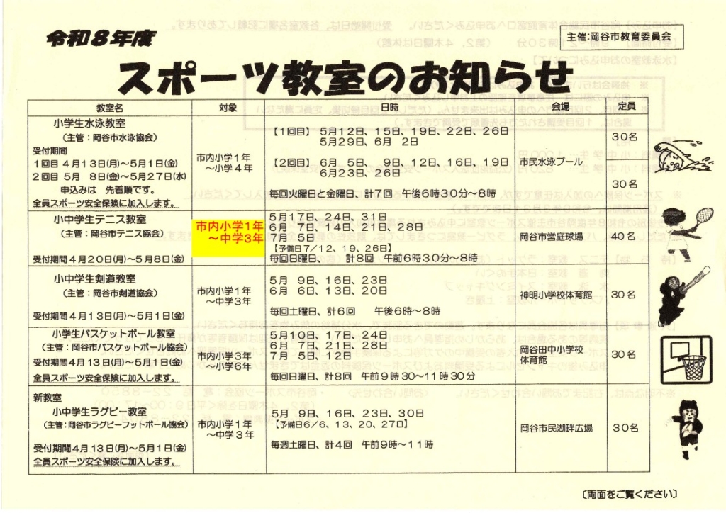 岡谷市教育委員会主催のスポーツ教室募集要項です。全8回のコースです。申し込み... -