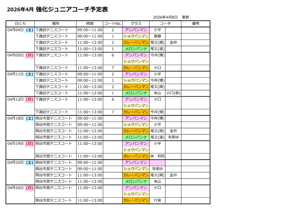 <ジュニア部>ジュニア強化練習 コーチ予定表 & 欠席連絡